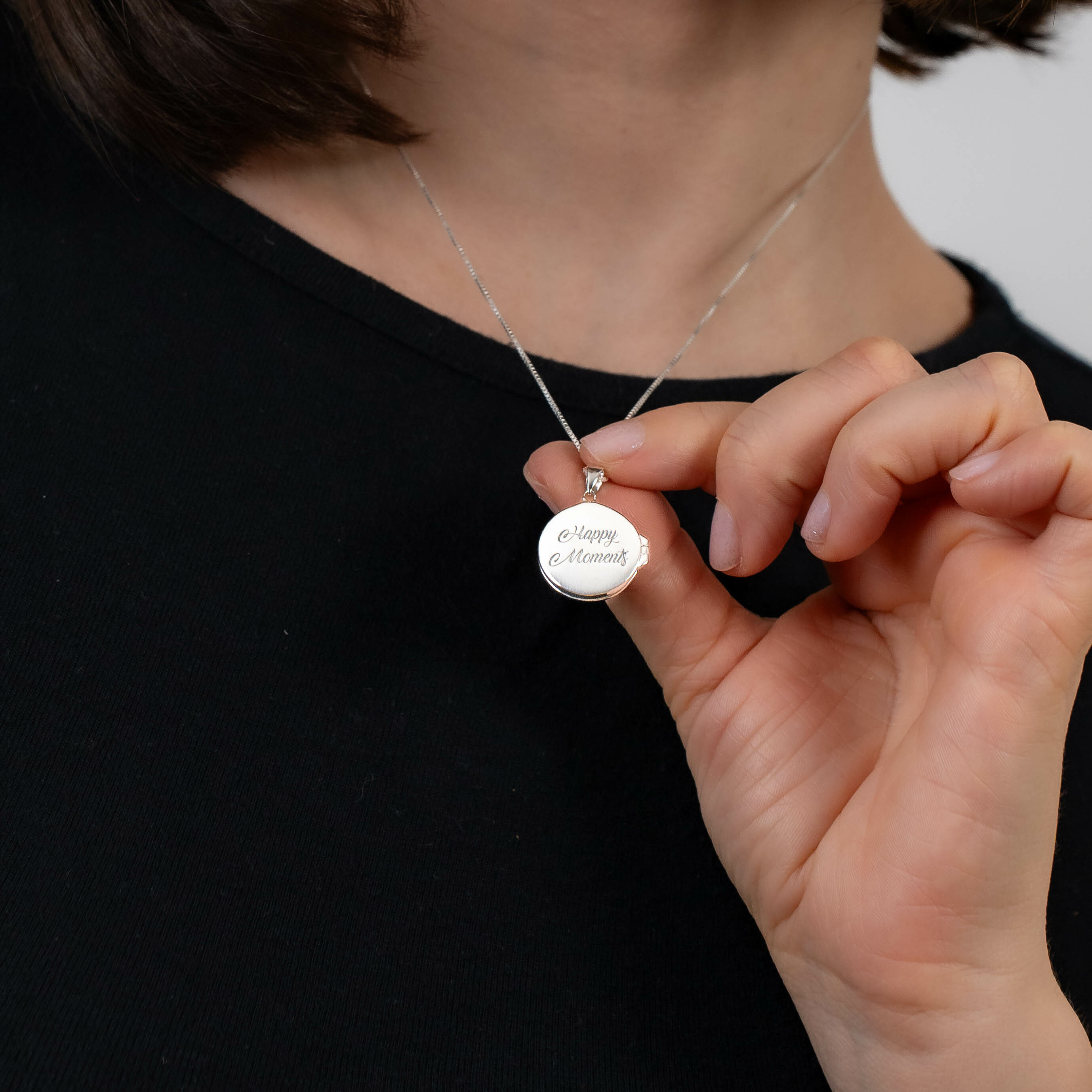 Pe fata medalionul prezinta un cristal Zirconia stralucitor, iar pe verso poate fi personalizat cu o gravura speciala. Printre personalizarile populare se numara gravarea numelor celor dragi si mesaje de iubire.