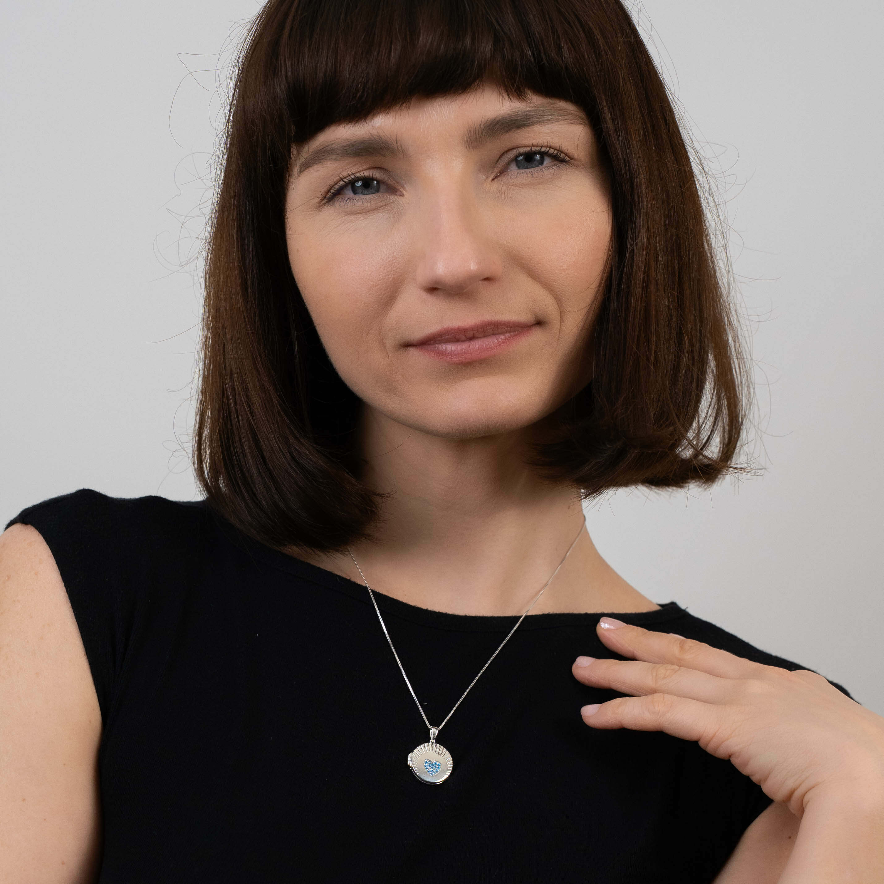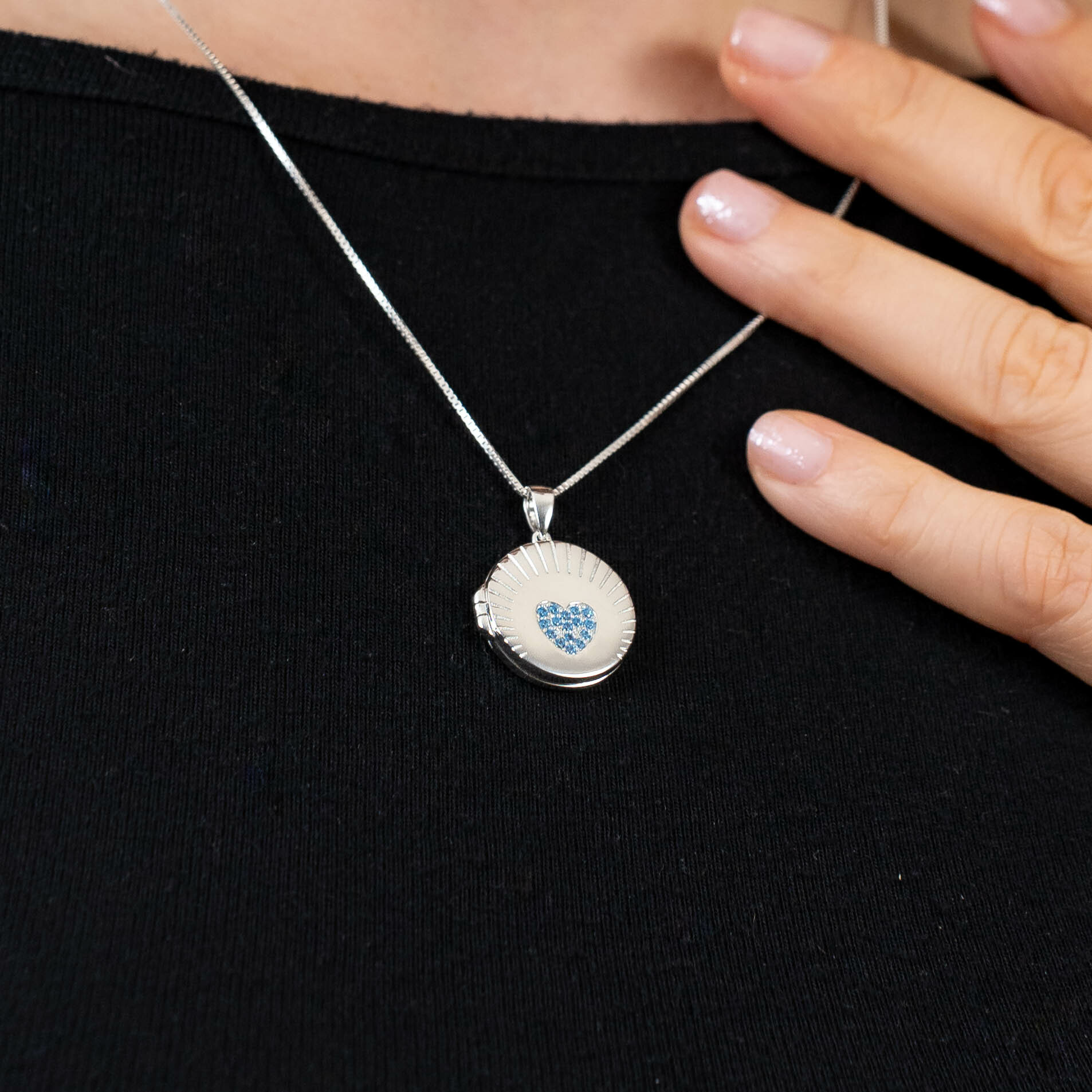 Pe fata medalionul prezinta o inima plina cu cristale Zirconia albastre, iar pe verso poate fi persoanlizat cu o gravura speciala. Printre personalizarile populare se numara gravarea numelor celor dragi si mesaje de iubire.