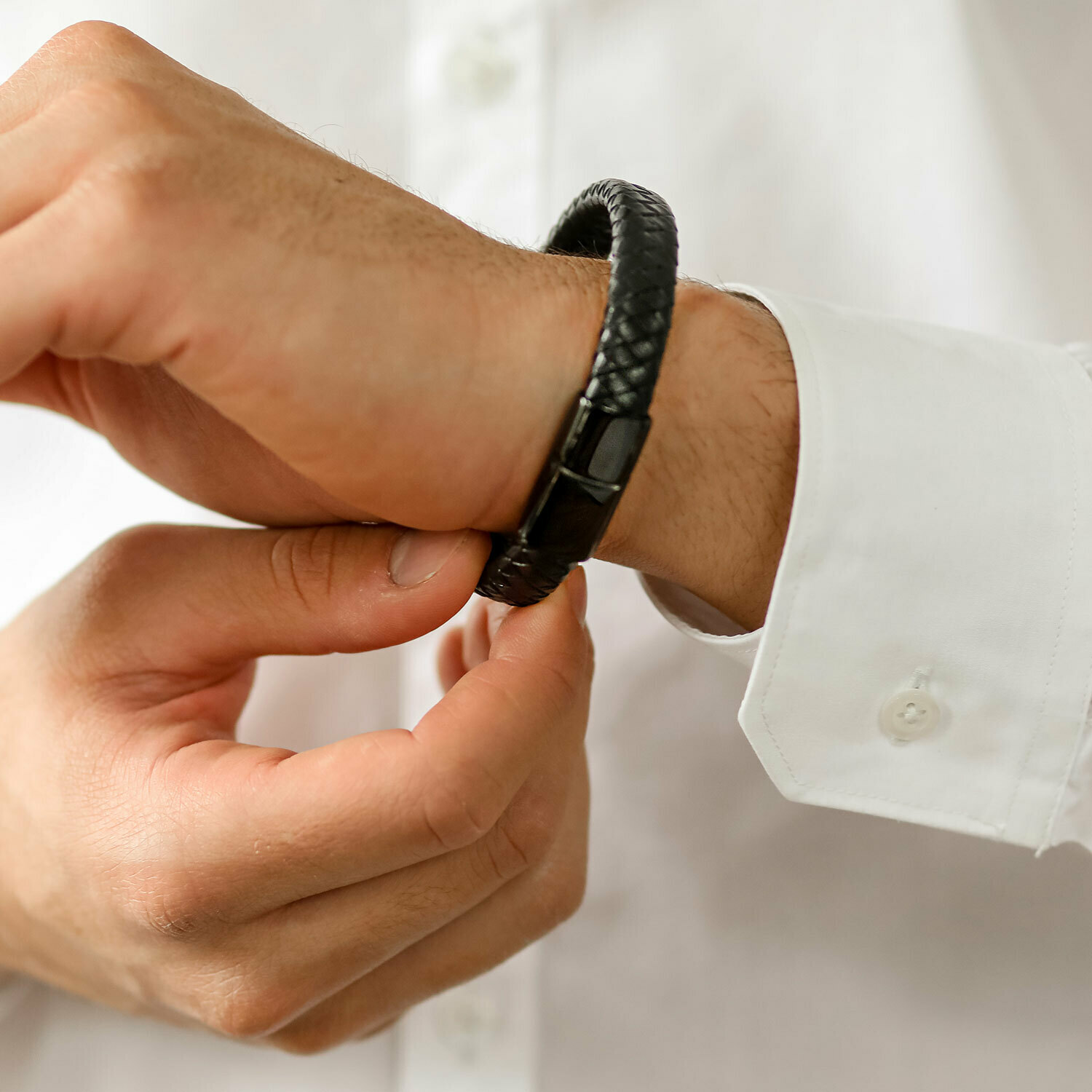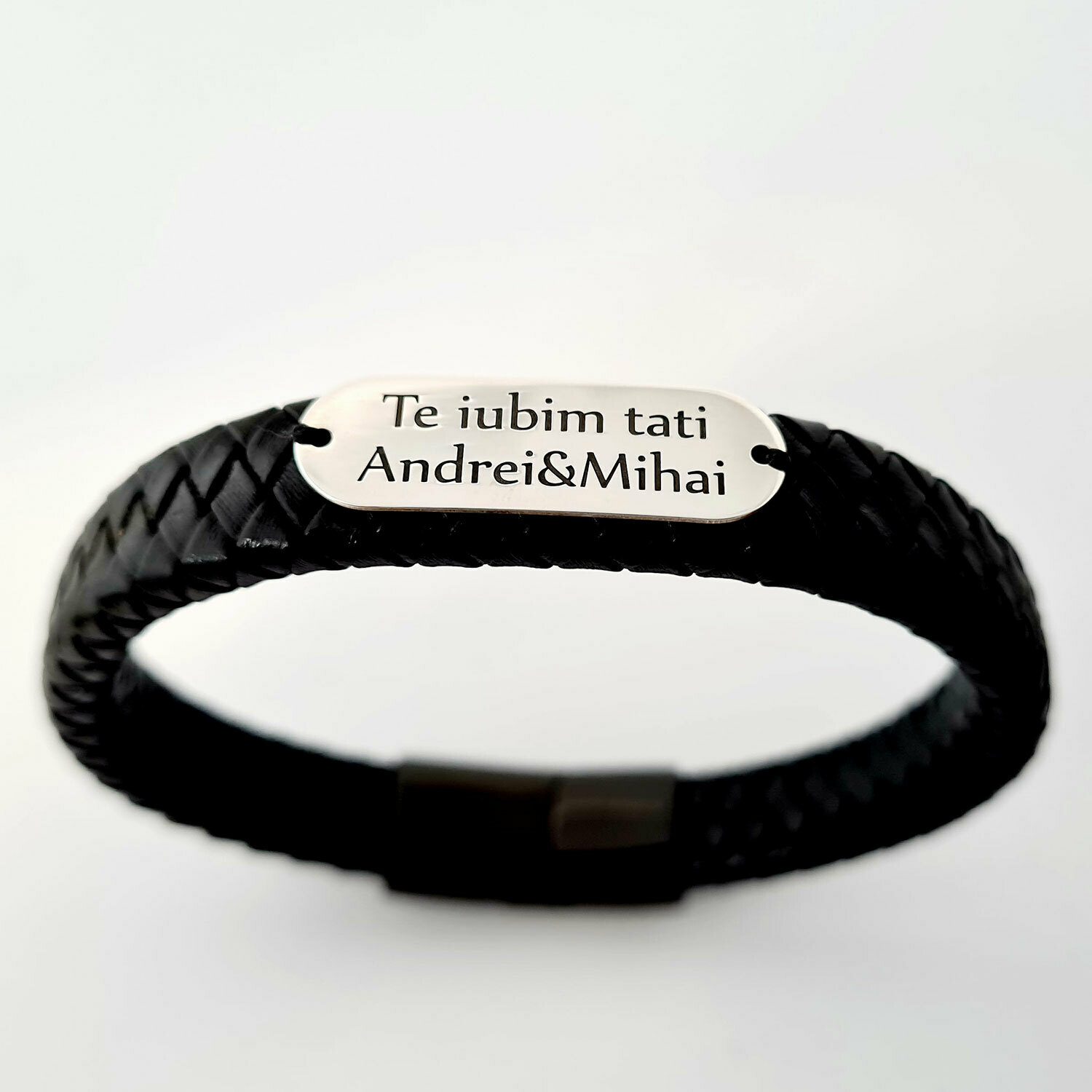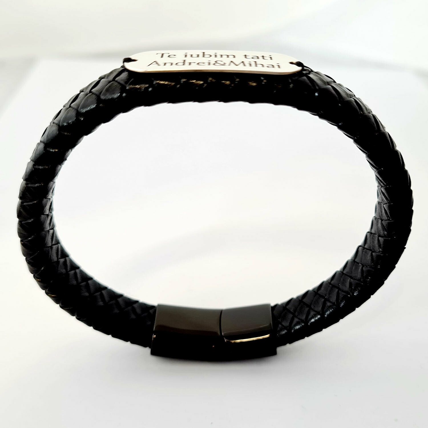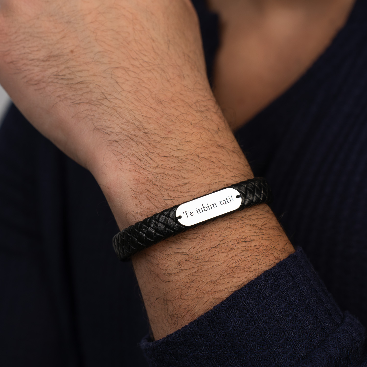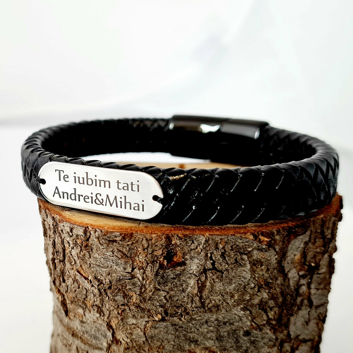 Ofera unui domn mult iubit o bratara eleganta din piele impletita cu o placuta personalizata din Argint si cu inchizatoare magnetica. Alege sa gravezi pe placuta un mesaj personal din suflet, cele mai frumoase ganduri ce vor fi mereu pretuite.