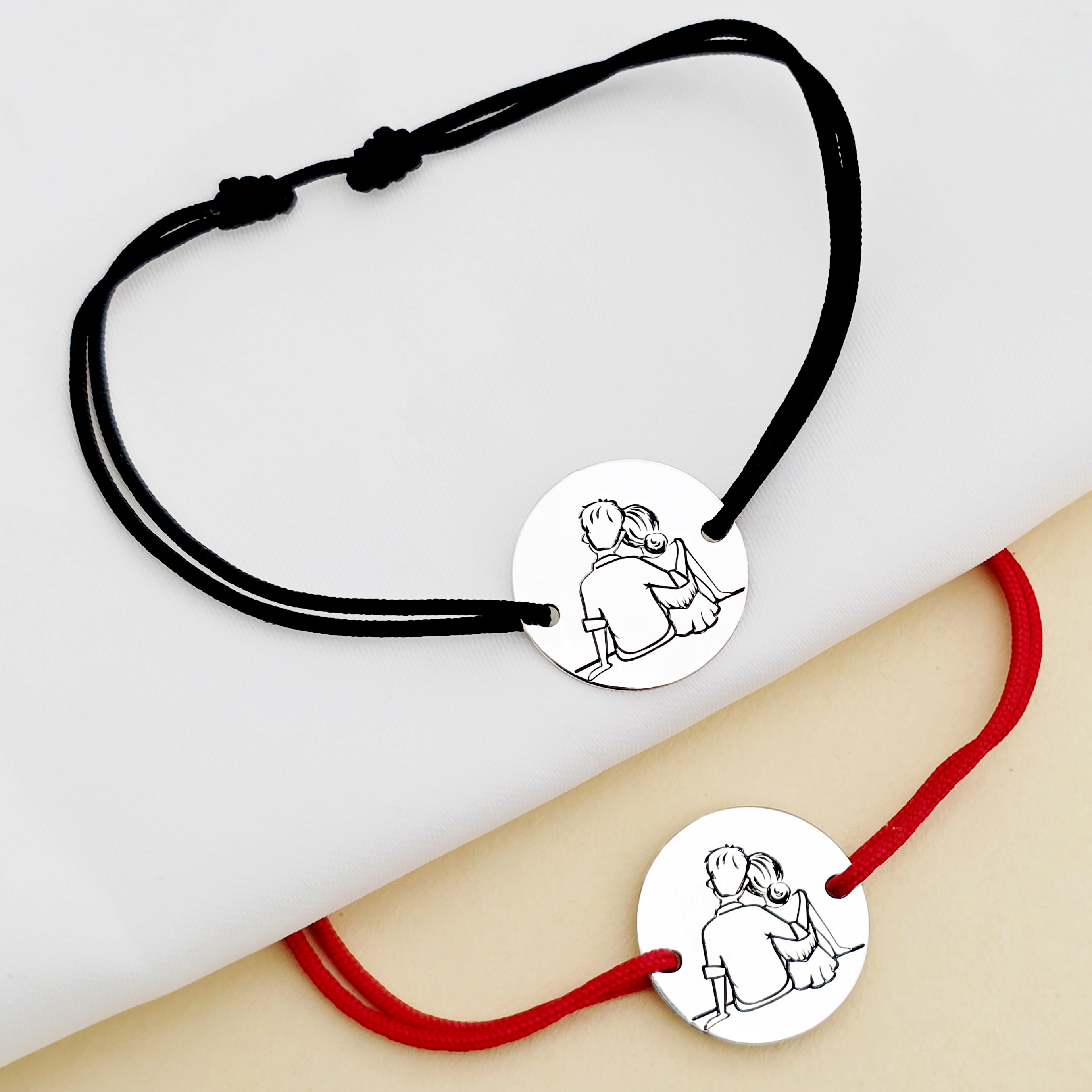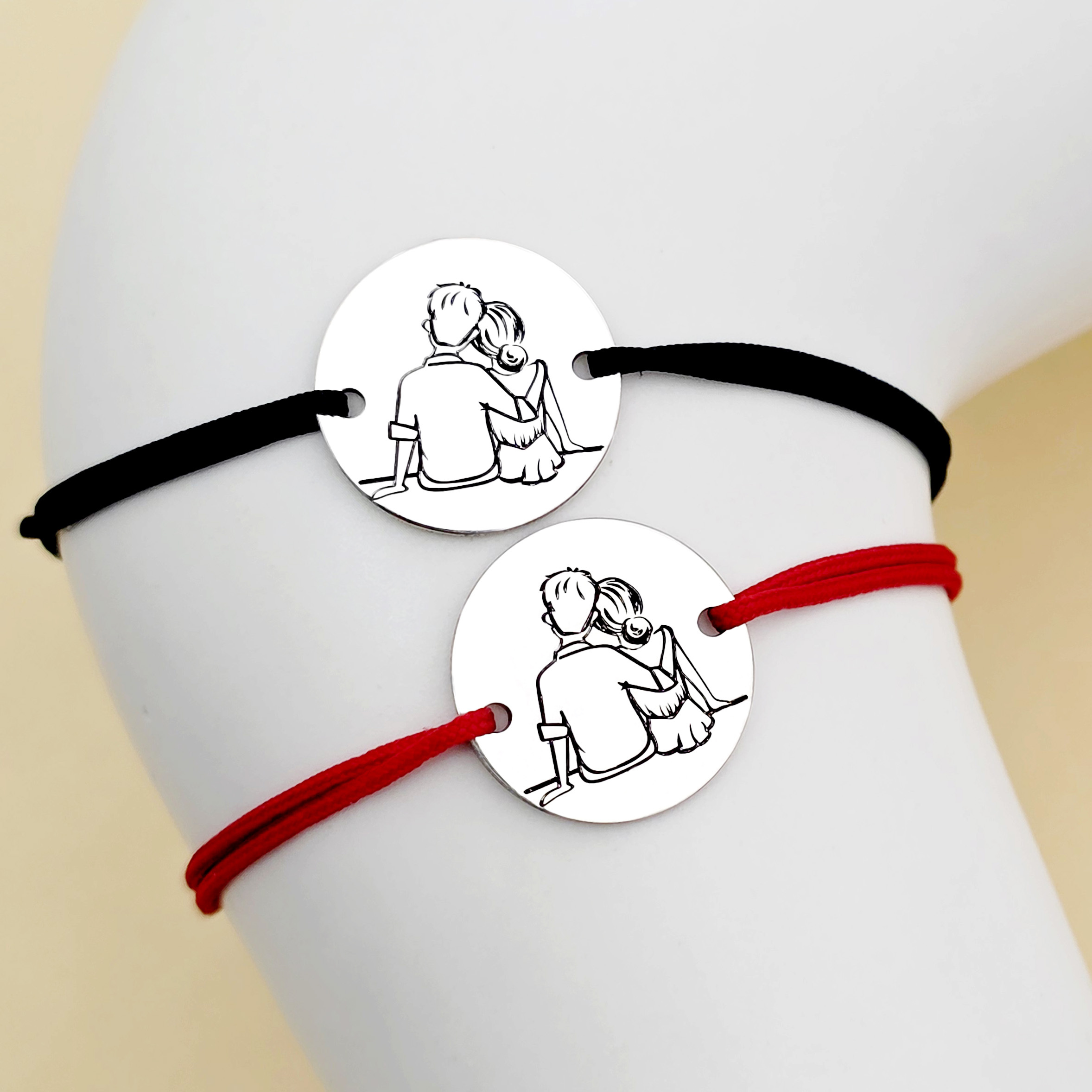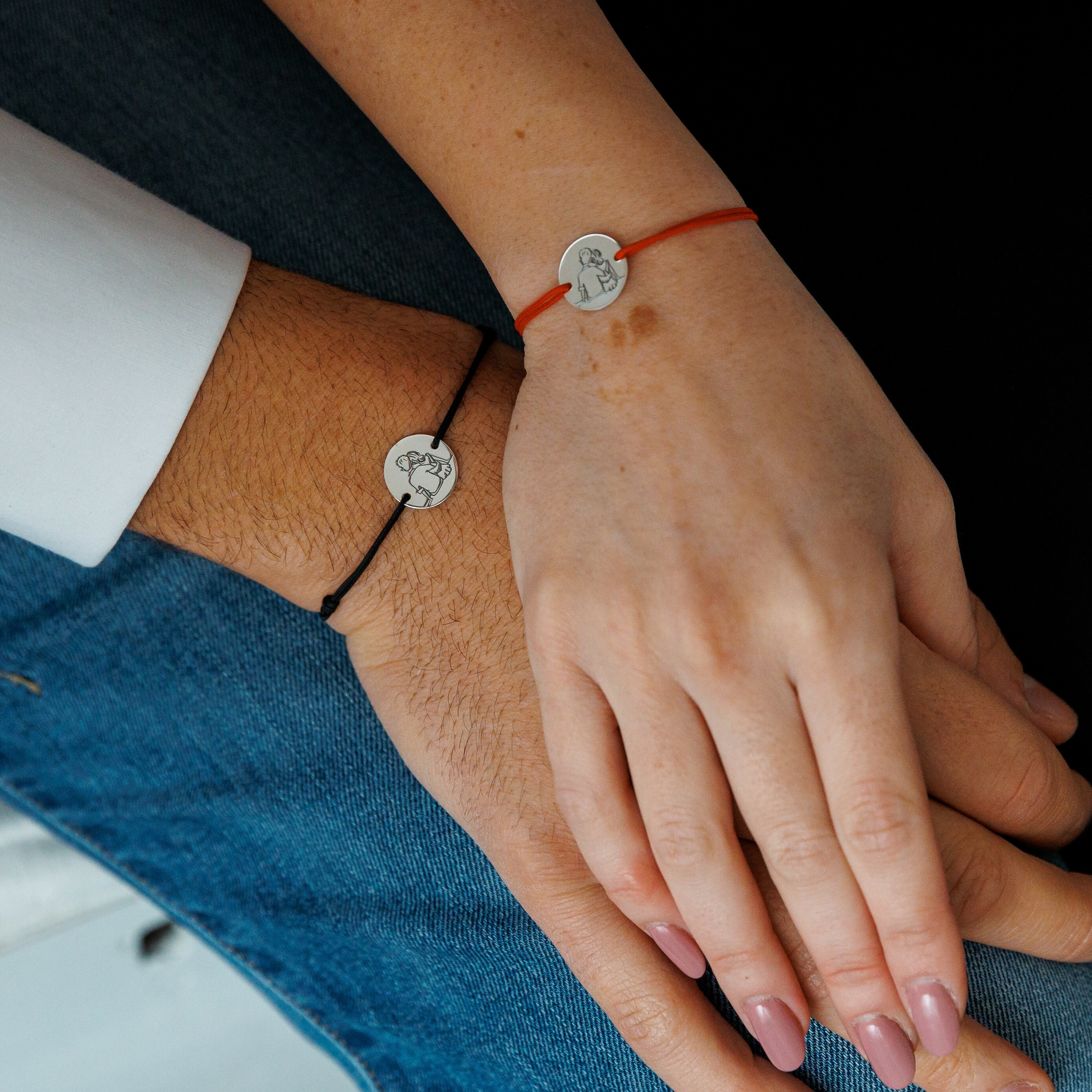Bratarile din set sunt create din Argint 925 prin taiere si gravare laser, avand diametrul banutului de 15 mm si fiind atasate de un snur de matase vegetala, marime reglabila. Pretul afisat este pentru ambele bratari si gravarea inclusa.