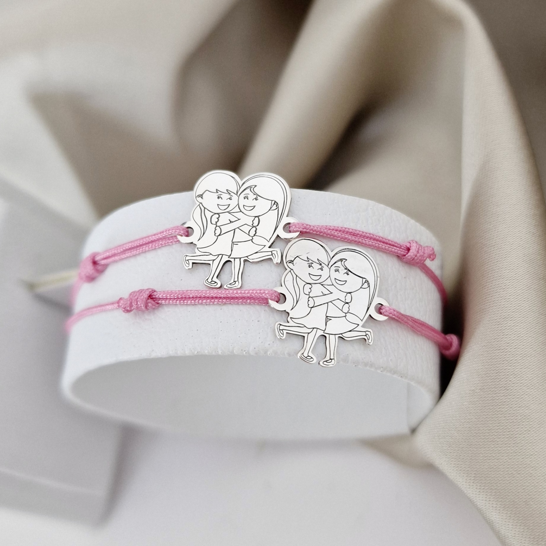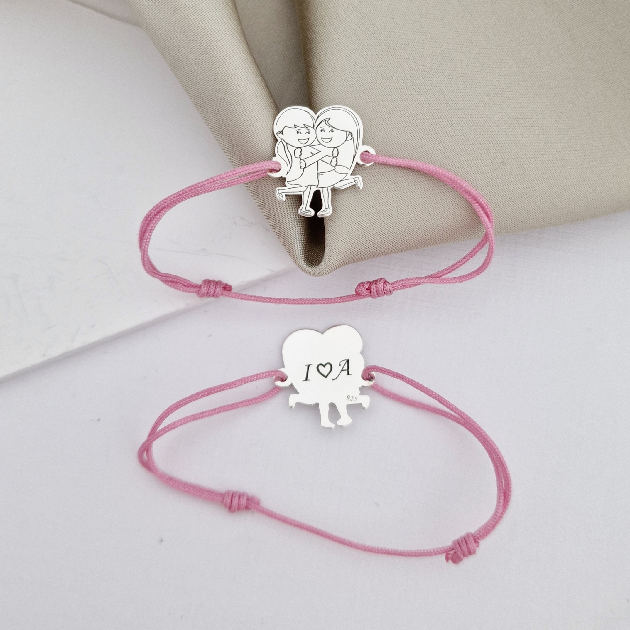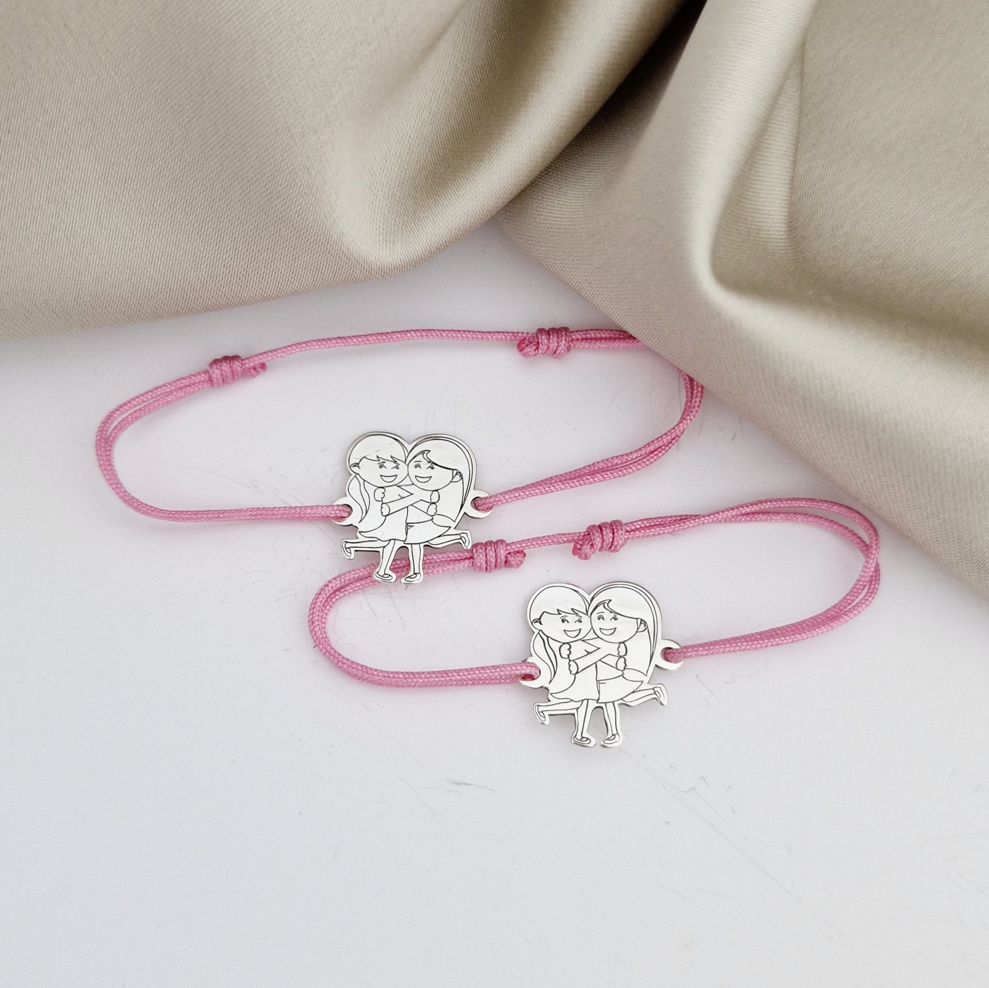 Set 2 bratari personalizate - Model decupat - 2 fete/surori/prietene imbratisate - Argint 925 - snur reglabil