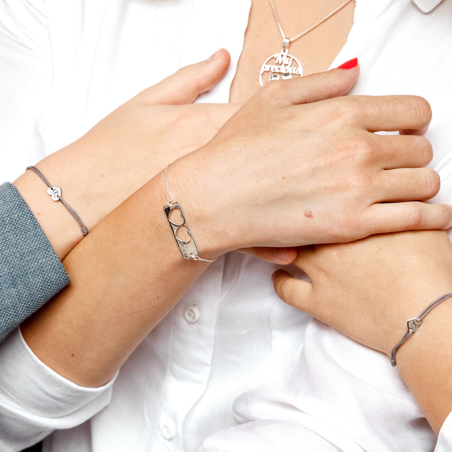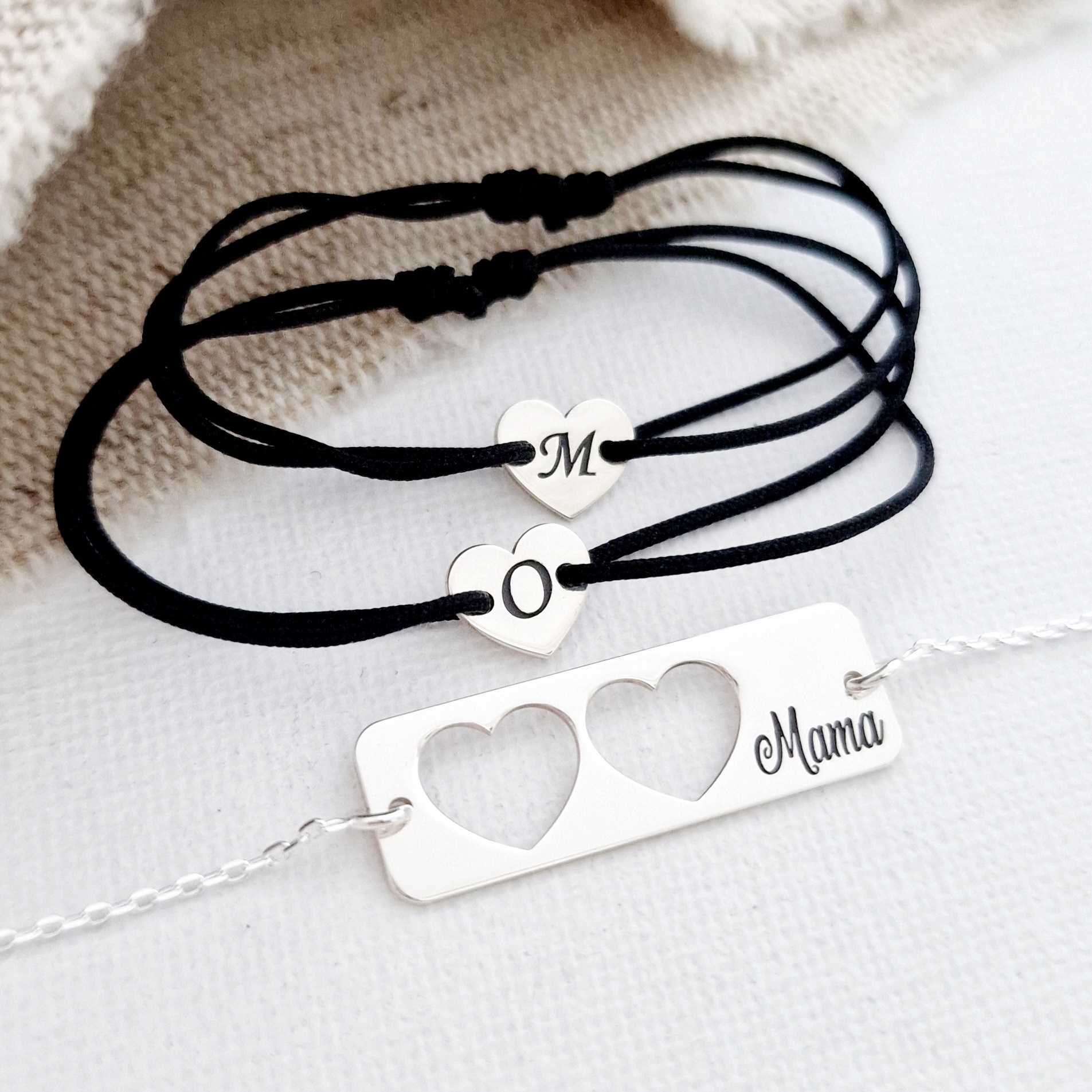 Set 3 bratari personalizate - Mama cu 2 fete - Placuta cu lantisor si 2 Inimioare decupate cu snur - Argint 925