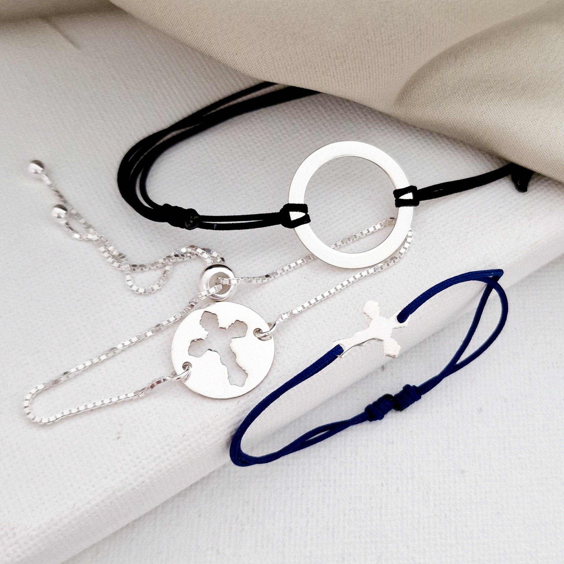 Set 3 bratari puzzle familie - Tata, mama si copil - disc, banut si cruce - Argint 925