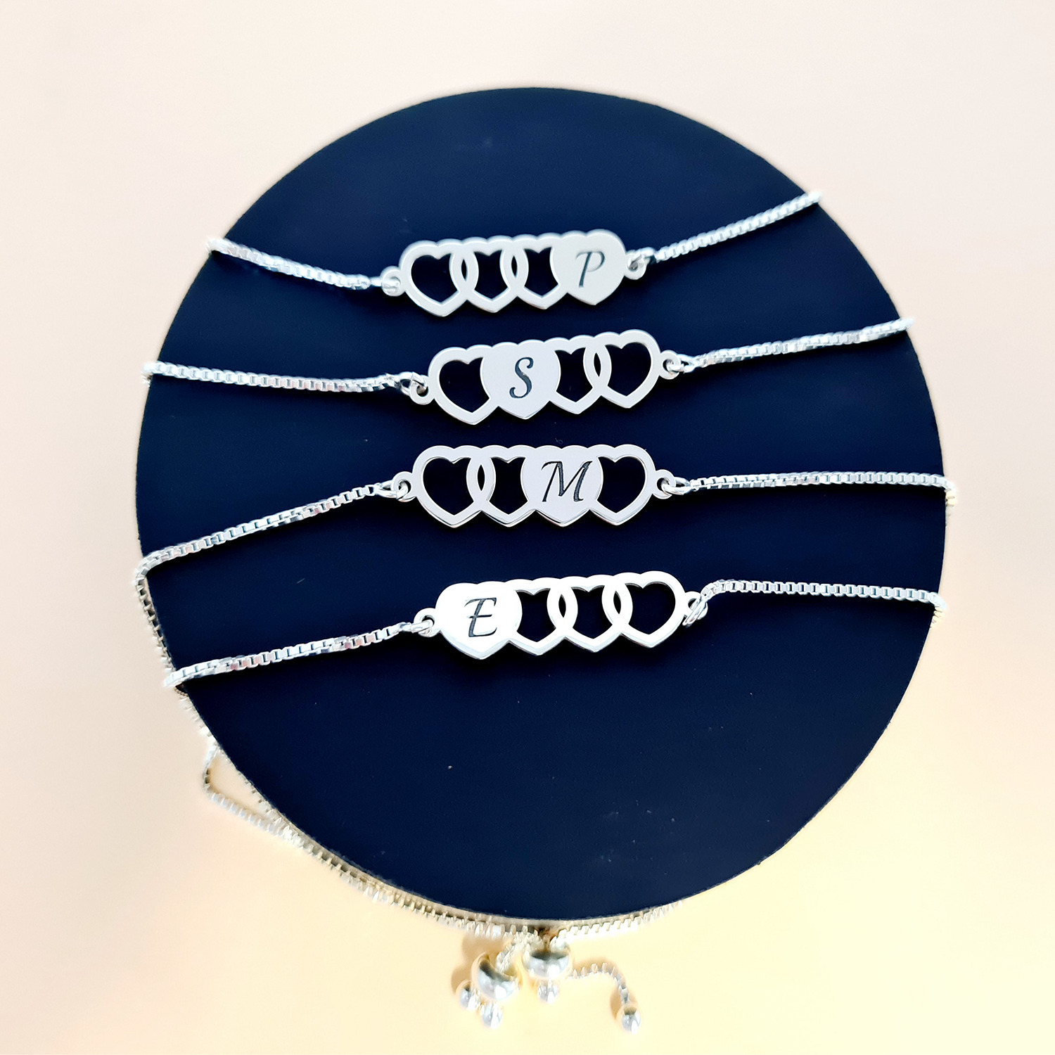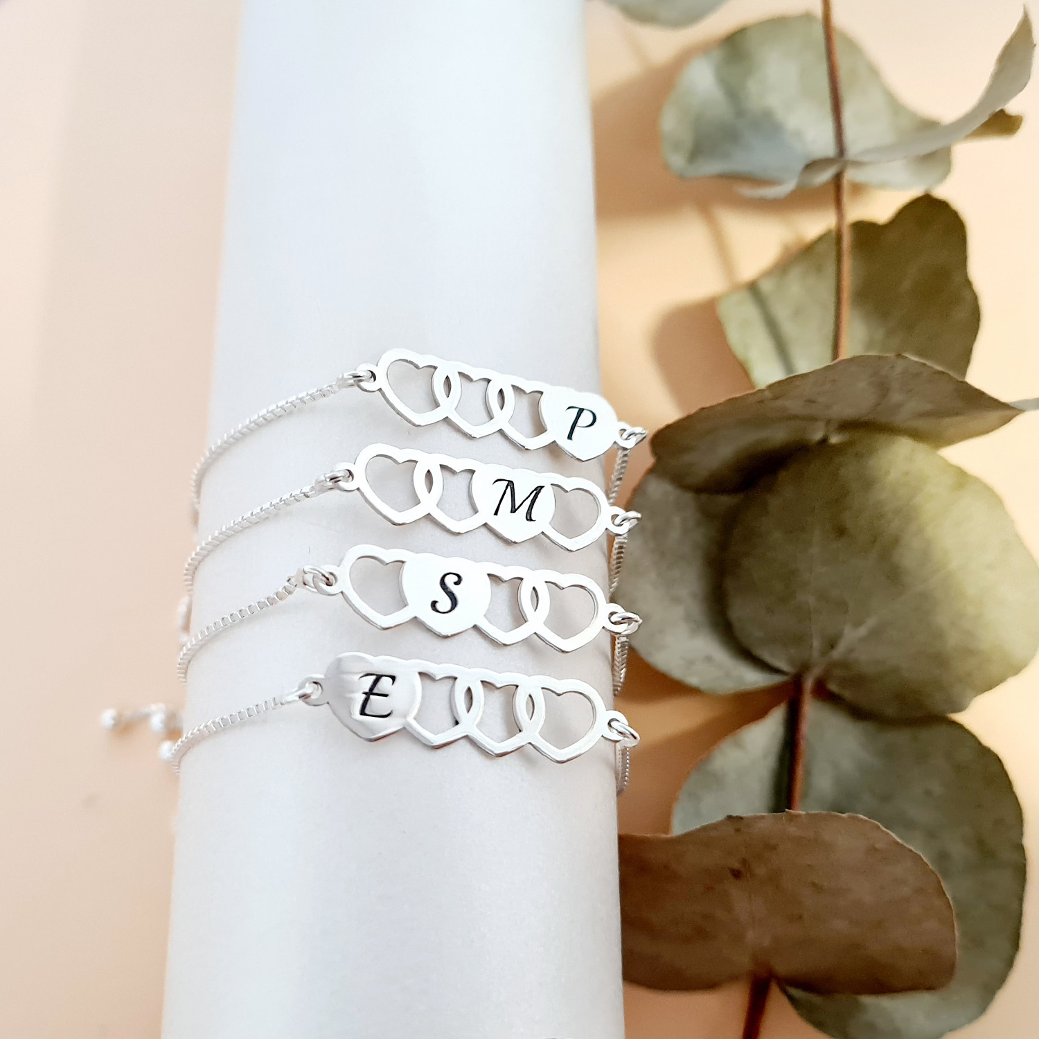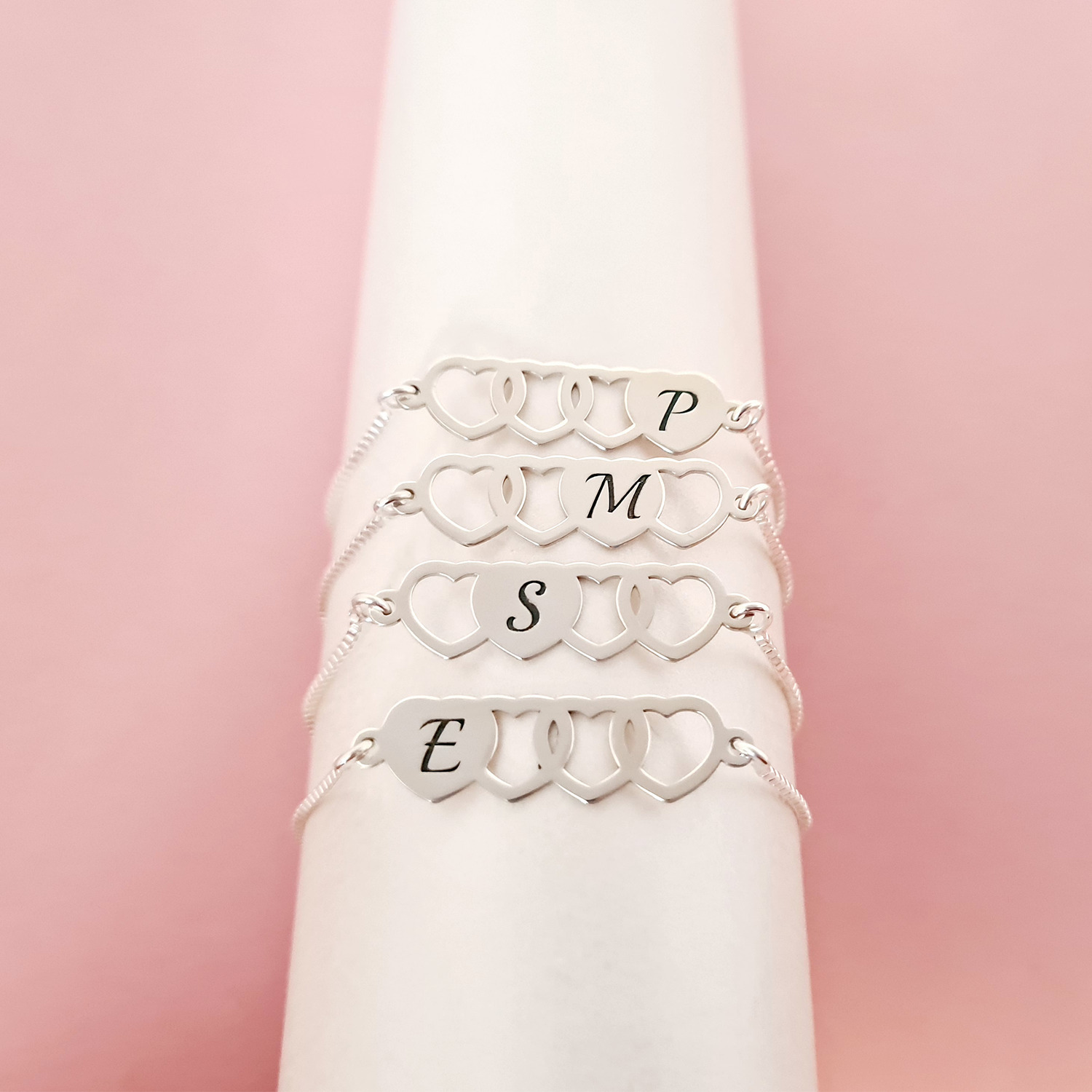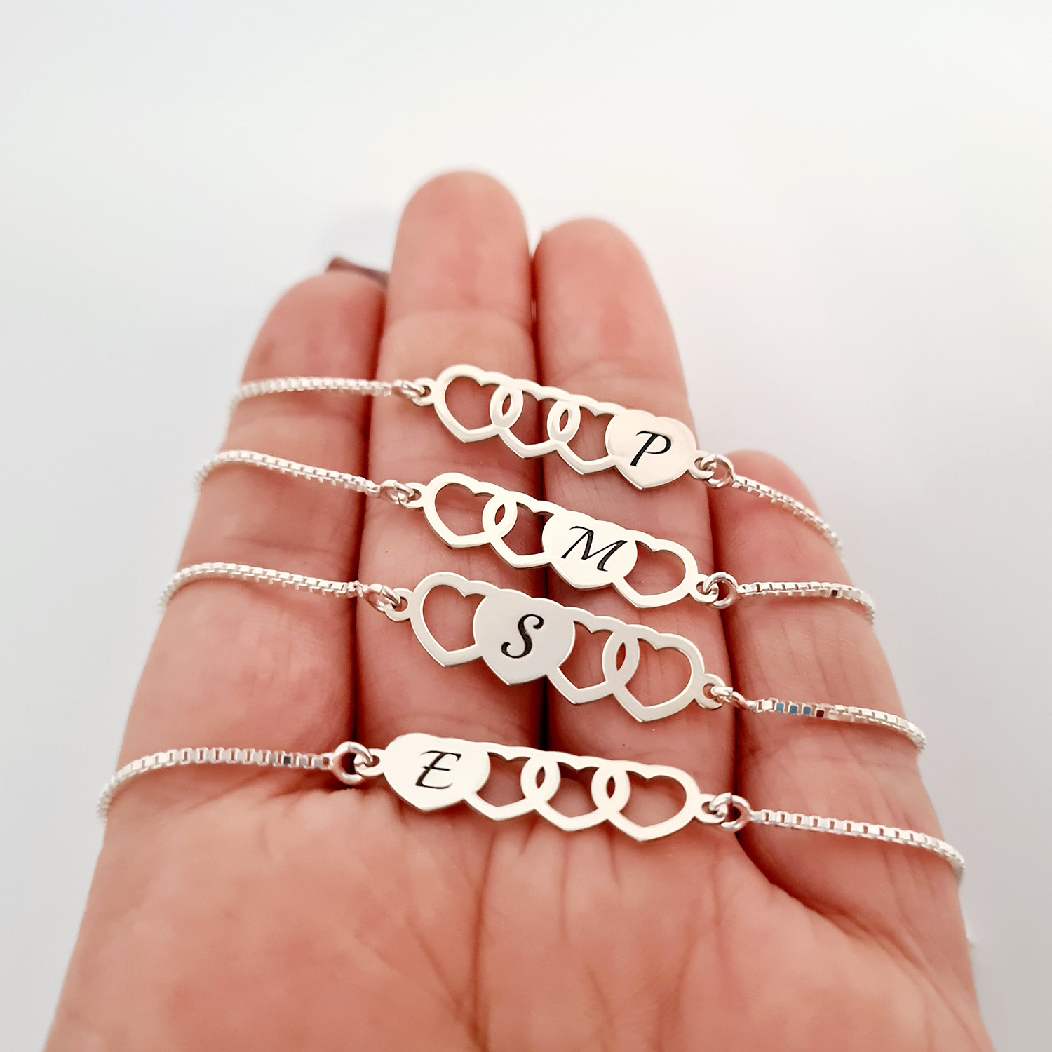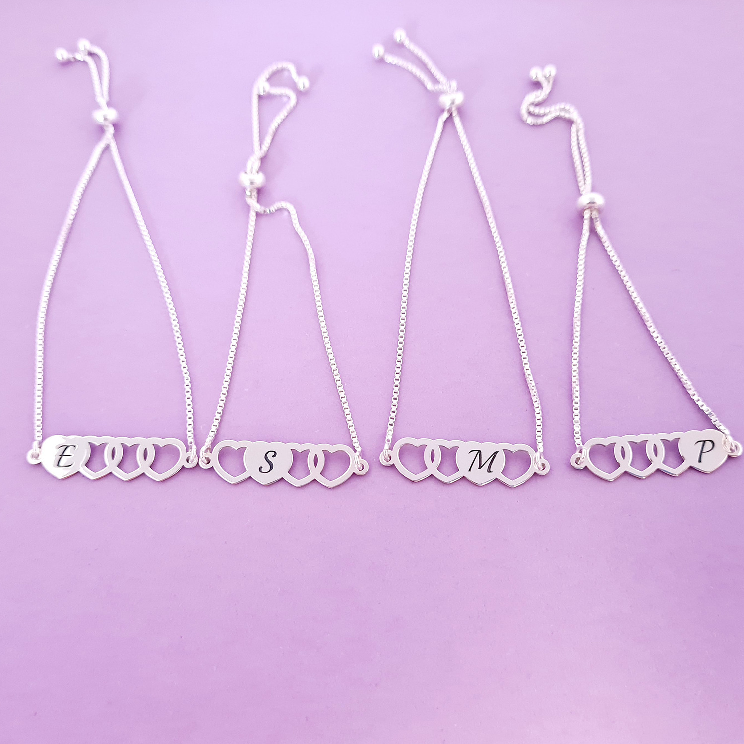 Setul nostru de 4 bratari cu lantisoare glisante si pandantive personalizate cu inimi si initiale este modalitatea perfecta de a celebra prietenia sau familia! Design-ul superb al pandantivelor prezinta 4 inimioare legate, iar fiecare difera prin pozitionarea inimii pline pe care este gravata o initiala.