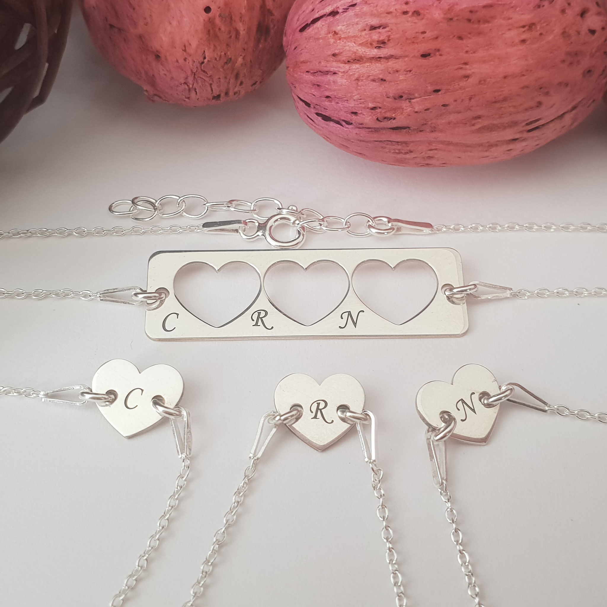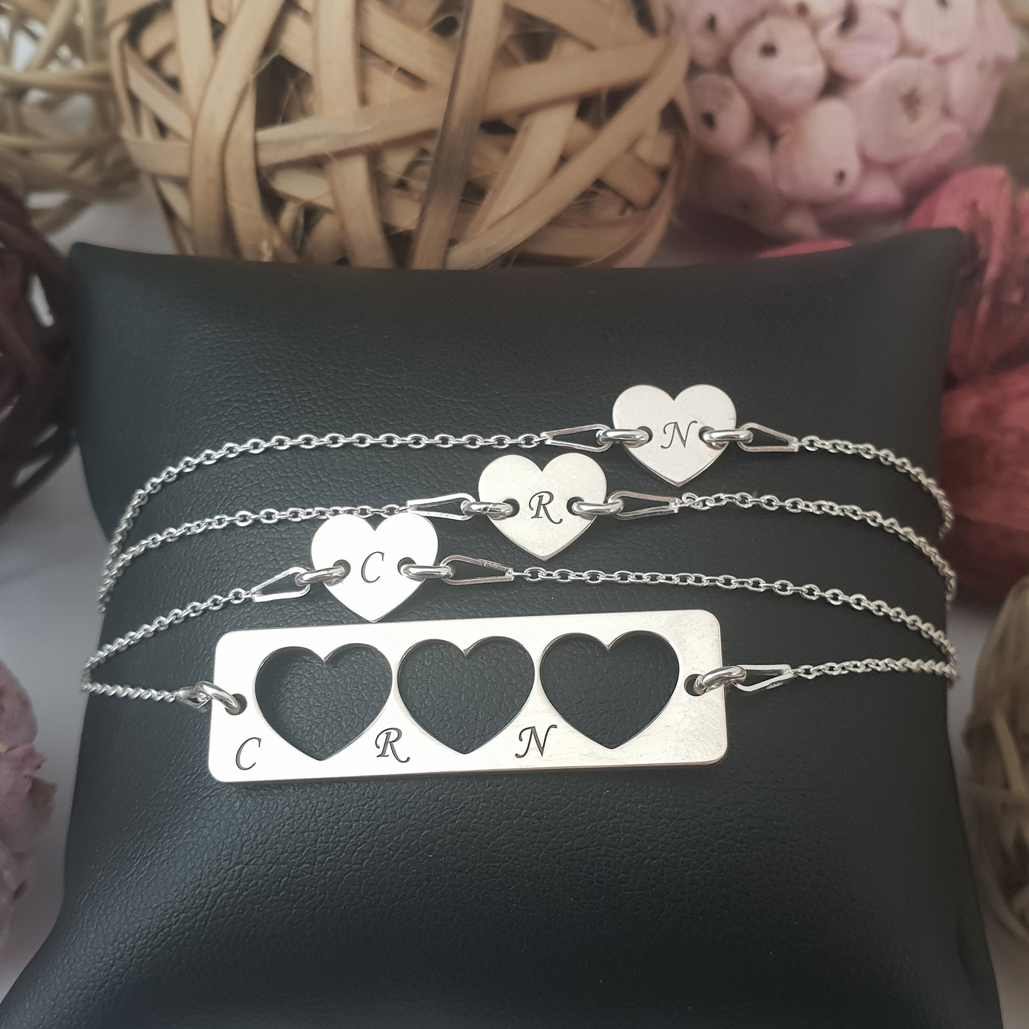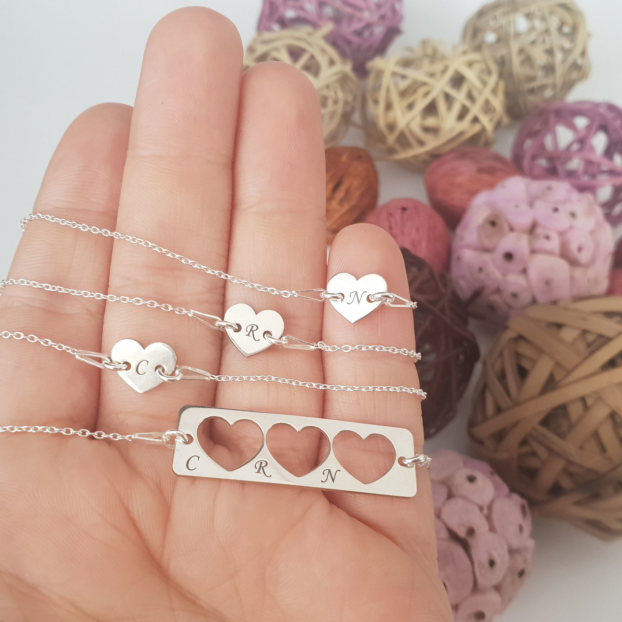 Set 4 bratari personalizate - Mama cu 3 fete - Placuta si 3 Inimioara decupata cu lantisoare - Argint 925