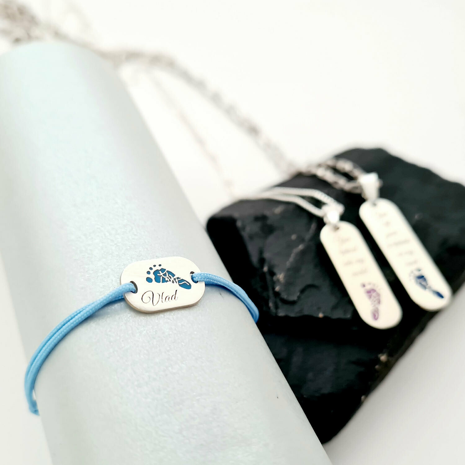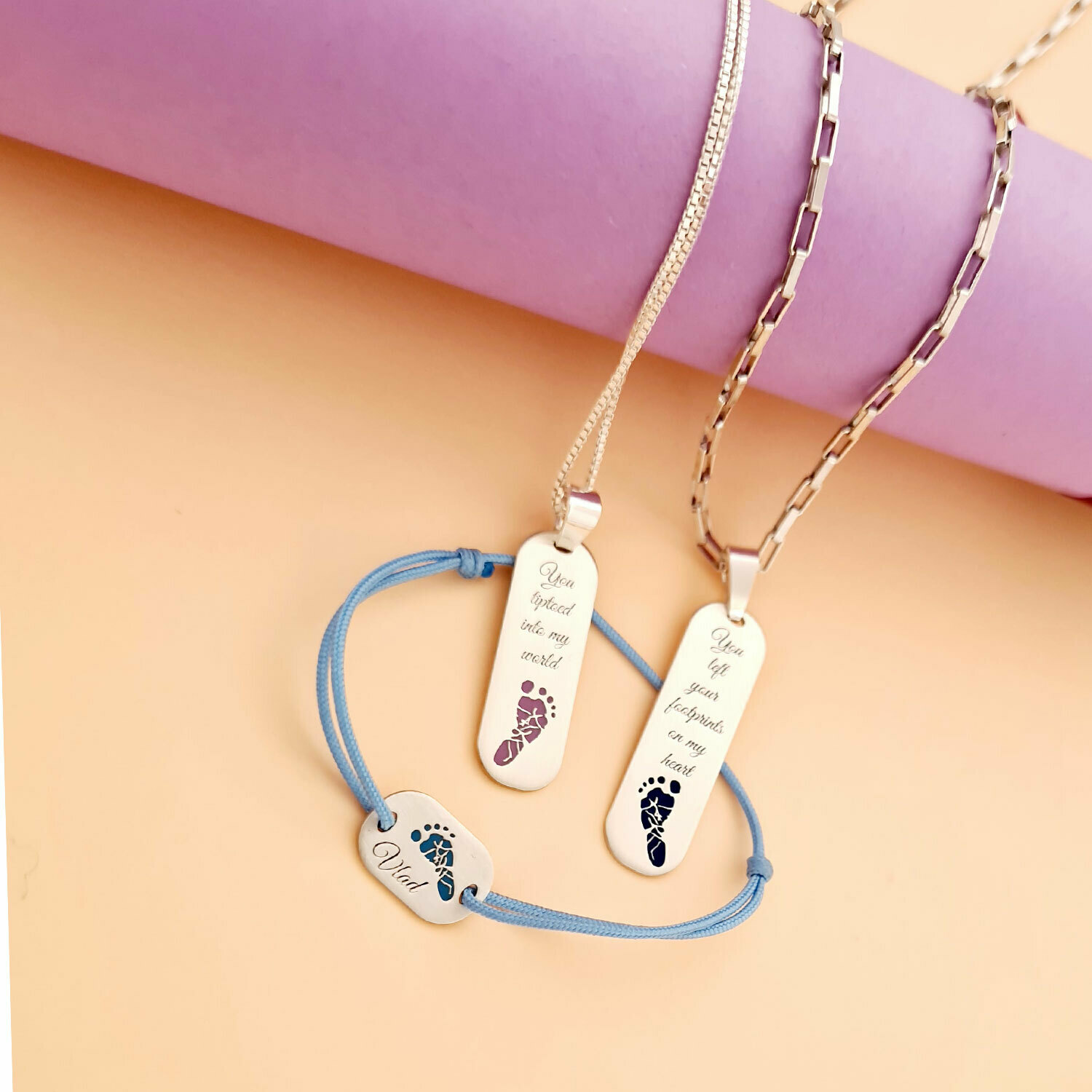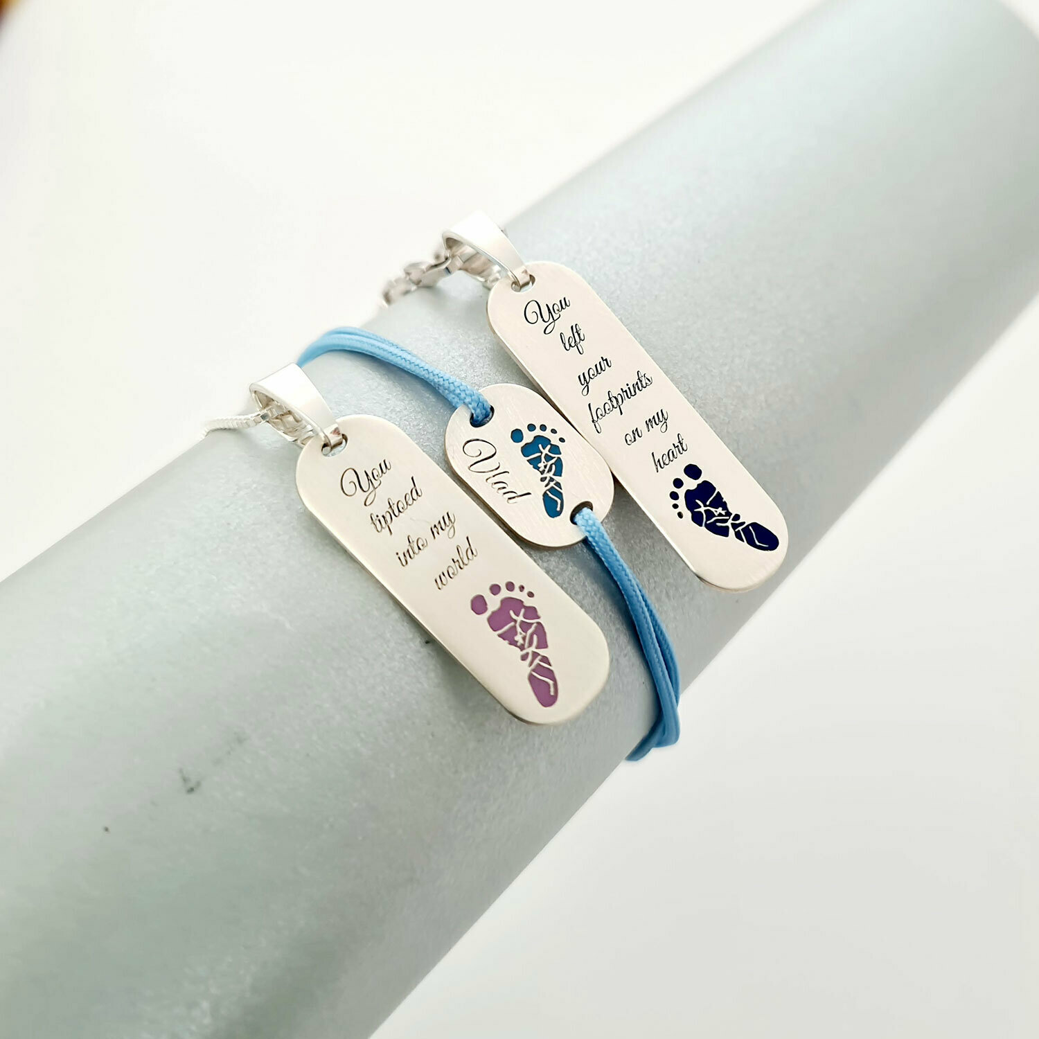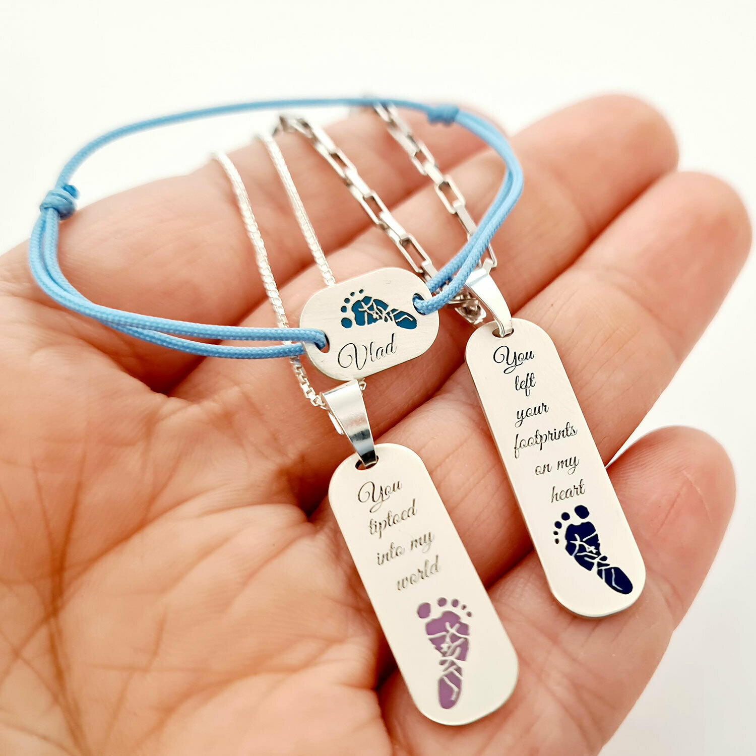 Fiecare piesa prezinta amprenta unui picior ce sunt decoarate cu email colorat. Daca iti doresti alte texte sau mesaje gravate completeaza toate informatiile in casuta "Alte detalii".