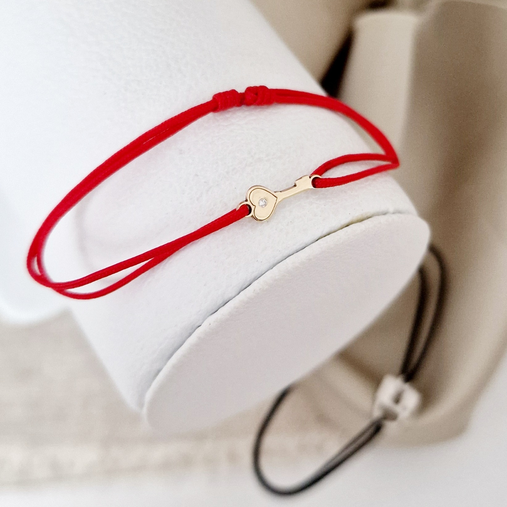 - Bratara 1: Cheie de 13x5 mm din Aur Galben 14k cu Diamant incolor cu o claritate VVS1 si snur rosu