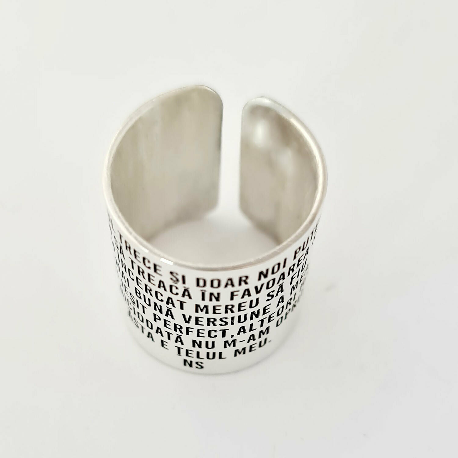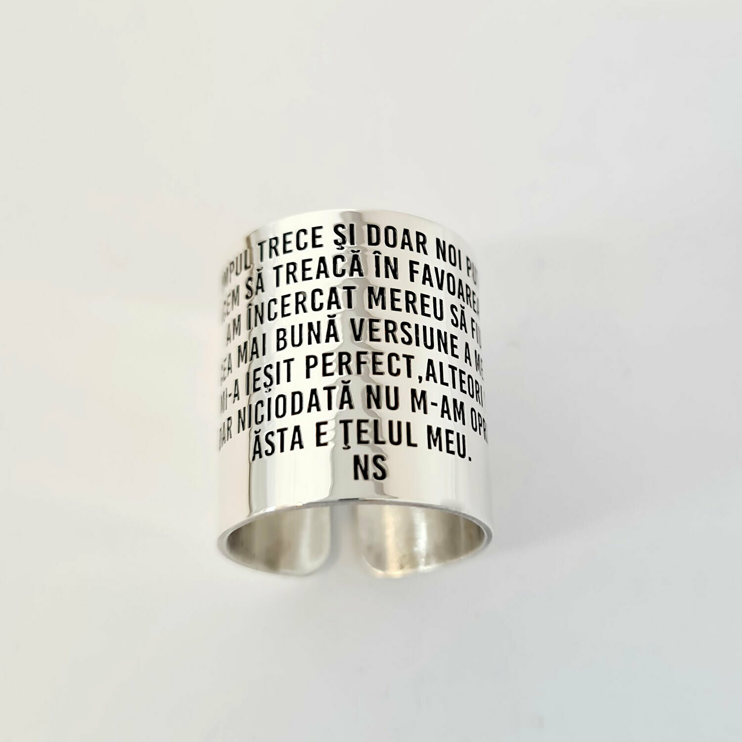 Text gravat pe inel: TIMPUL TRECE ŞI DOAR NOI PUTEM SĂ ÎL FACEM SĂ TREACĂ ÎN FAVOAREA NOASTRĂ. AM ÎNCERCAT MEREU SĂ FIU CEA MAI BUNĂ VERSIUNE A MEA. UNEORI MI-A IEŞIT PERFECT,ALTEORI MAI PUŢIN DAR NICIODATĂ NU M-AM OPRIT. ĂSTA E ŢELUL MEU. NS