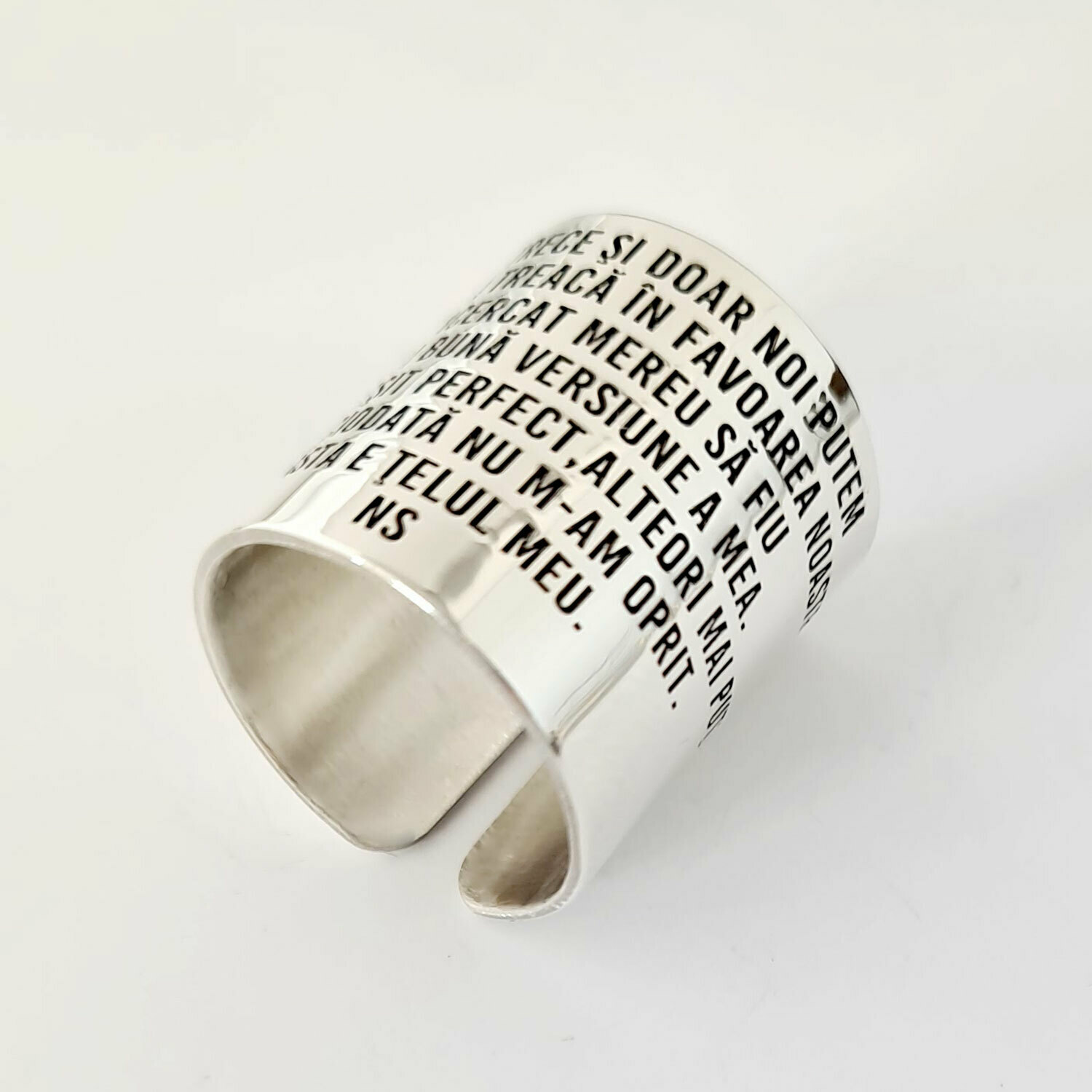 “Inelul a iesit mult mai bine decat ma asteptam! De la inceput mi s-a parut geniala ideea de a include un minitext personalizat pe un obiect pe care il porti cu tine in fiecare zi, ca sa iti reaminteasca constant de ceva in care tu crezi. Va multumesc pentru inel si sa fiti siguri ca voi mai comanda😉 ”